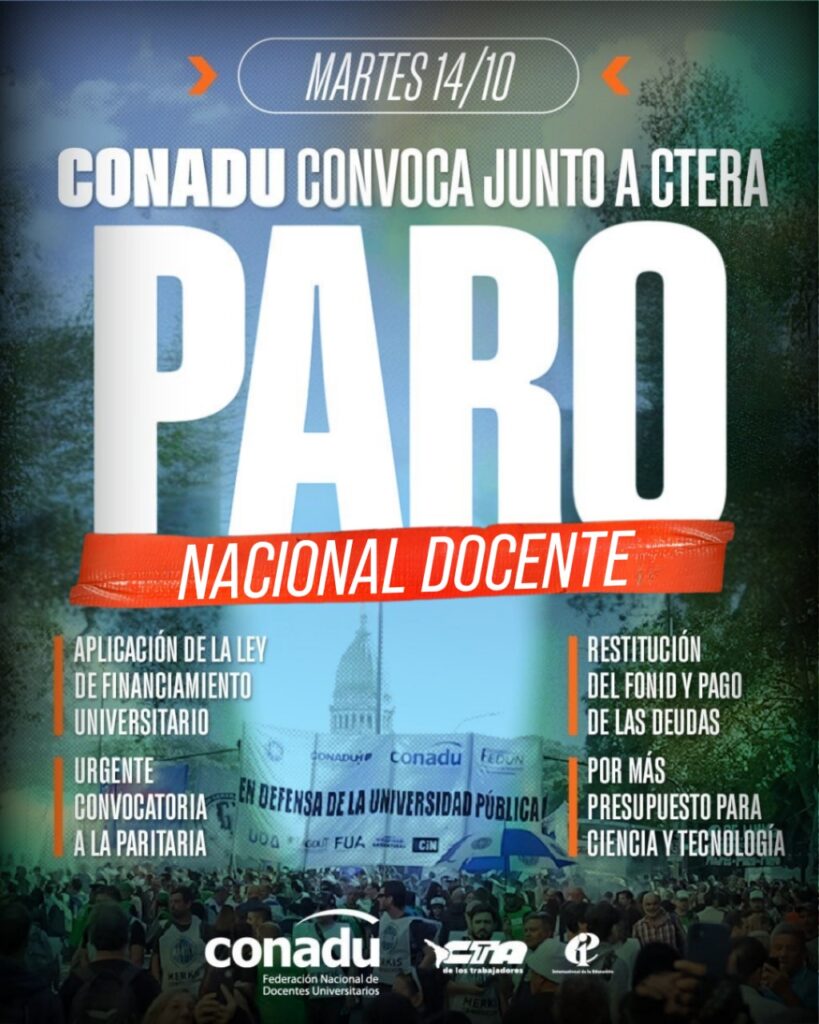 De manera inconsulta y a destiempo, la conducción saliente de la CONADU acaba de comunicar la adhesión al PARO NACIONAL DOCENTE impulsado por CTERA para el martes 14 de octubre.