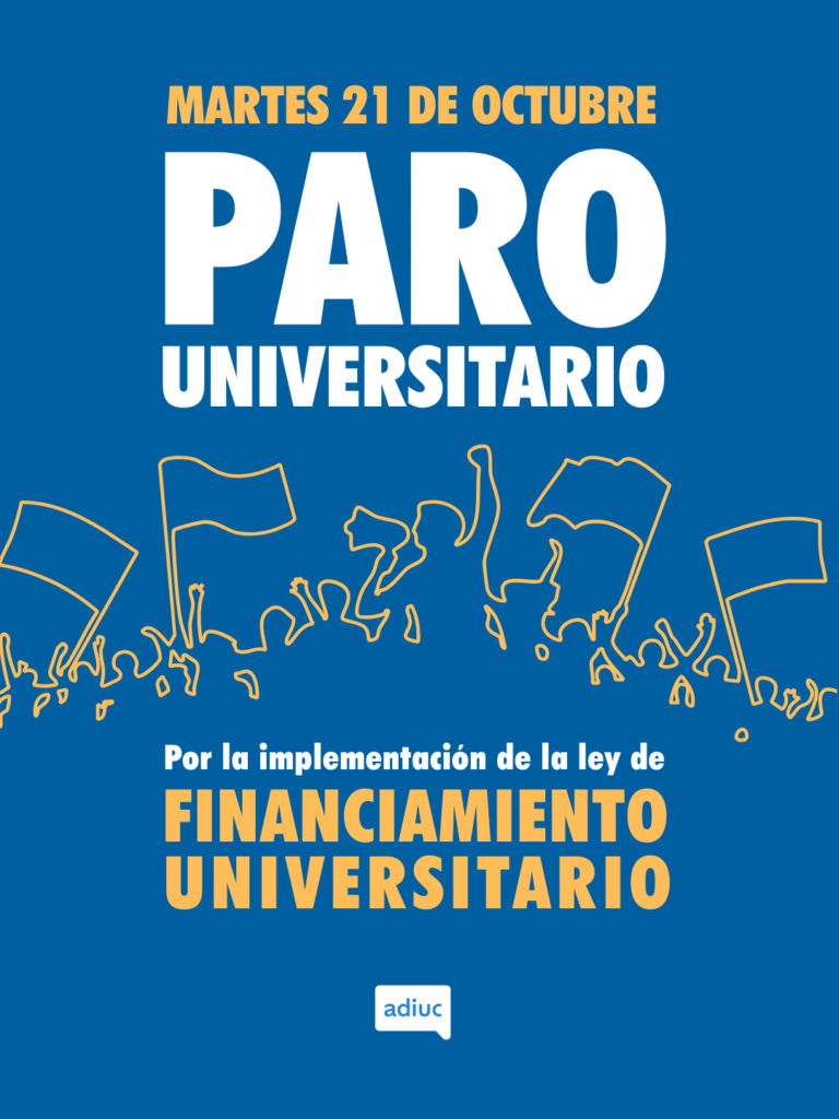 El Plenario de Cuerpos Orgánicos de ADIUC resolvió convocar al PARO UNIVERSITARIO este martes 21 de octubre. Dada la demora de Conadu en confirmar la fecha de la medida de fuerza anunciada el viernes pasado, y vencido el plazo legal para la promulgación de la Ley de Financiamiento Universitario, vamos a un paro total de actividades junto al sindicato nodocente de la UNC.