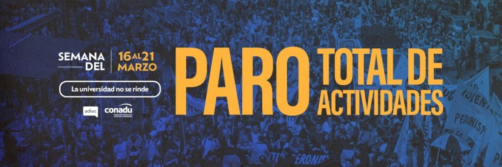 Convocamos al paro total de actividades en la semana que va del lunes 16 al sábado 21 de marzo. Sin asistencia a los lugares de trabajo, suspendiendo todas las tareas de docencia, investigación y gestión. La medida fue resuelta por el plenario de nuestra federación nacional, Conadu, a partir de los mandatos elaborados en las asambleas y consultas realizadas por la treintena de gremios de base que integran la federación.