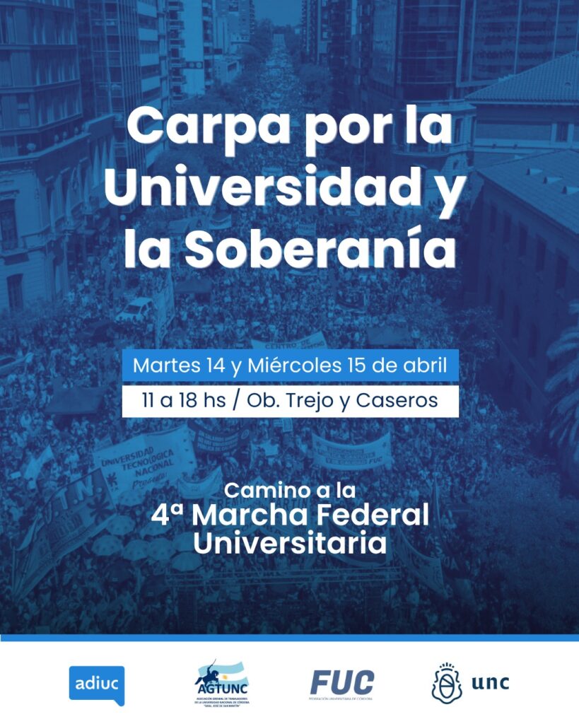 Docentes, nodocentes, estudiantes, graduados/as y autoridades universitarias organizamos y convocamos a la CARPA POR LA UNIVERSIDAD Y LA SOBERANÍA que ya está recorriendo la región centro del país. El martes 14/4 llega a la ciudad de Córdoba, donde permanecerá hasta el miércoles 15/4. En breve daremos a conocer la agenda de actividades previstas.