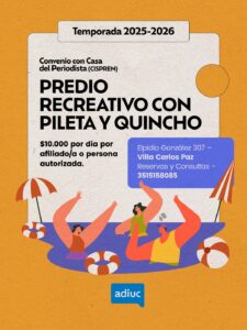 AfiliadxsInicio Afiliadxs Disfrutá los beneficios para afiliados/as. Todos los BeneficiosAlimentación SaludableAlojamientosAsesoríasCapacitaciónConveniosOtros BeneficiosPlan de viernesSalud LaboralTalleres Todos los Beneficios Alimentación Saludable Alojamientos Asesorías Capacitación Convenios Otros Beneficios Plan de viernes Salud Laboral Talleres Club Parque Vélez Sarsfield – 10% DESCUENTO La Casa del Periodista – Villa Carlos Paz Descuentos en la Librería Universitaria de EDUVIM Predio Recreativo Quinta AGEPJ – Temporada 2025/2026 Deporbas | 15% de descuento en Escuelas de Verano Tarifas preferenciales en instalaciones turísticas de UEPC COPA V GENERAL PAZ | 10% de descuento Biodanza | Taller intensivo (nivel inicial) Bordado | Taller intensivo (nivel inicial) “EL CLUB DEL CHORINHO” | 22 de agosto | Plan de viernes TOURS EN BICICLETA | Descuento para afiliados/as Trekking 2025 – Descuentos para afiliados/as HASTA 40% DESCUENTO | REDES DE GIMNASIOS Clases de Aikido | Descuento para afiliados/as Yoga para todas las edades y niveles | Descuento para afiliados/as EOS Distrito Deportivo | Descuentos exclusivos para afiliados/as Comadres | Comida casera Monte Adentro | 5% de descuento | Envío gratis Juarez Celman Florece “LAS OVEJAS YA NO SUEÑAN” | Teatro en “Plan de Viernes” Beneficios exclusivos para afiliados/as de ADIUC del Banco CREDICOOP PAC (Productores a consumidores) – 10% de descuento + envío gratis Plan de viernes | TEATRO Y MÚSICA | 5/7 Cooperativa 4 Esquinas | Quesos caseros Proveeduría Mutual Argentina SIRIPA, O LA QUE NO IMPORTABA Federación Rural para la Producción y el Arraigo Y Otras Yerbas Almacén | 10% de descuento Buen Vivir – Red de Almacenes Populares Taller para niños/as | ARTE Y DANZAS DEL MUNDO Taller de Yoga Taller de Danza popular y folklórica latinoamericana Descuentos en productos de la canasta escolar Taller de Ajedrez Apart Hotel BALCONES DEL CERRO | Santa Rosa de Calamuchita | 20% DESCUENTO Complejo PINARES AL ALBA – Almafuerte | 10% DESCUENTO Seminario de posgrado | LA ENSEÑANZA EN LA UNIVERSIDAD Seminario-Taller | Evaluación de prácticas socio-educativas en proyectos sociocomunitarios NOTAS PARA PENSAR Y HACER FEMINISMOS ANTI-CAPACITISTAS | Taller de actualización profesional-docente gratuito Taller de educación postural para el ejercicio de la odontología Bolsones Escolares 2024 ¿Un futuro no demasiado humano? | Preguntas para un país | 5° encuentro “Potencialidades y desafíos en la formación de profesionales en agroecología” EL PROCESO DE ENVEJECIMIENTO EN LA CULTURA ANTI EDAD | Taller para personas mayores Prácticas de extensión: escenarios de aprendizaje y procesos de subjetivación ¿MAÑANA ES MEJOR? | 4 encuentro | Preguntas para un país ADIUC al Teatro, Comunidad de Espectadores REINTEGRO 20% | CURSOS DE IDIOMA Los Viajes de la Mirada: un recorrido por el mundo a través del cine | Taller para jubilados/as PACHI HERRERA junto al Club del Charango Córdoba 20% de descuento en Espacio Kraken Mara Santucho y sus Cuerdas Infieles | Tango, bolero, balada, swing Mery y Juan Murúa | Cancionero folklórico y tanguero argentino Taller de educación postural |Talleres para docentes Primeros Auxilios | Taller para docentes Salud visual: saber para ver | Taller para docentes Trabajar con la voz | Taller para docentes ÁREA 51 – Rock nacional e internacional Taller de Aikido Taller de Danzas Folklóricas Seminario de Conversaciones Filosóficas ENTRADAS GRATUITAS | Todo el teatro de Córdoba CINECLUB MUNICIPAL | ENTRADAS GRATUITAS PARA AFILIADOS/AS Bolsones Escolares 2023 CAMINATAS (trekking) ¡Vuelve PLAN DE VIERNES! | PAOLA BERNAL | 28 de octubre Taller de mantenimiento y reparación de bicis Taller de preparación de suelo y sustratos Taller de compostaje domiciliario EXCURSIONES EN BICICLETA Mujeres y lactancias: el derecho a maternar y trabajar | Conversatorio LA CASONA DE CALMAYO | Santa Rosa de Calamuchita | 10% de descuento HOTEL SOLARES CUMBRECITA | LA CUMBRECITA | 20% de descuento SOLARES HOTEL | ALTA GRACIA | 20% de descuento Hotel PORTAL DE LA VILLA | Villa del Dique | 15% de descuento HOTEL FARO SERRANO | Villa General Belgrano | 20% de descuento CABAÑAS VILLA PAN DE AZÚCAR | Cosquín | 10% de descuento Complejo Paraíso Azul | Villa Carlos Paz | 20% de descuento CABAÑAS LA VICENTINA |Cuesta Blanca | 10% de descuento Cabañas Aromas del Mediterraneo | Nono | 30% de descuento Posada del Río | Complejo de Cabañas | Los Reartes | 10% de descuento. LAS CATALPAS COMPLEJO TURÍSTICO | Mina Clavero | 10% de descuento Cabañas Villa Nazaret | Anisacate | 15% de descuento Asesoramiento Legal Encuentro de expresión y teatro para infancias| CUANDO EL TEATRO SE PONE EN JUEGO FESTEJAMOS EL DÍA DE LAS INFANCIAS ADIUC y el Banco Credicoop presentan un nuevo beneficio para afiliados/as Presente de fin de año Le debemos todo | Homenaje a Simone de Beauvoir ¡FESTEJAMOS EL DÍA DE LAS NIÑAS Y LOS NIÑOS! Consejería en salud laboral Conversación en inglés / Temporada de Talleres [FINALIZADO] Descuento en Hoteles | Afiliado/as ADIUC / CONADU Asesoramiento Contable Colaboración Actividades Académicas y Gremiales Subsidio por nacimiento o adopción