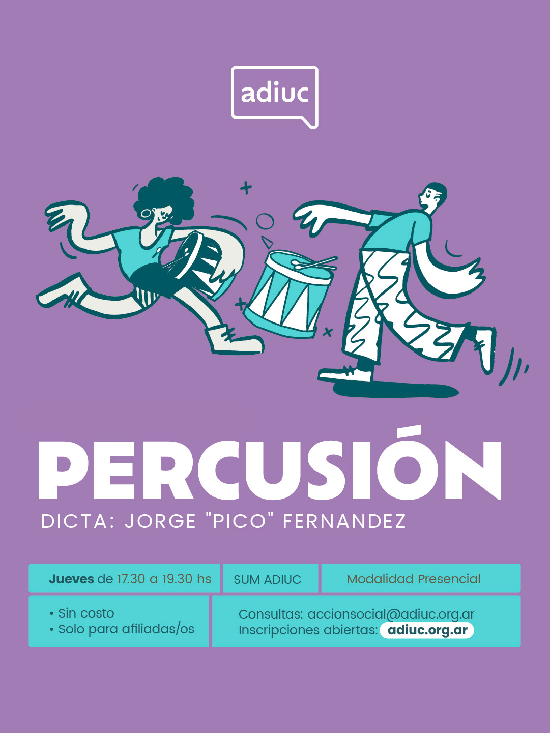Un espacio de práctica colectiva orientado a la percusión popular latinoamericana. El taller tiene un enfoque esencialmente práctico y una primera meta concreta: en cuatro clases, lograr una producción grupal que permita salir a la calle y sonar en movilizaciones.